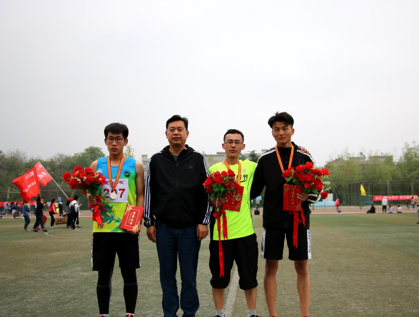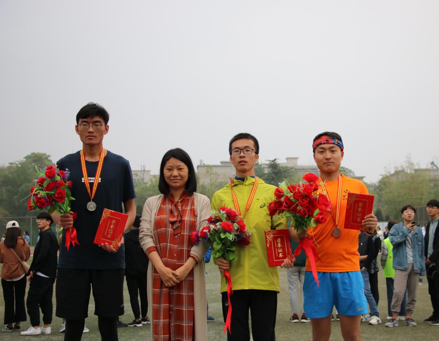 经过两天的拼搏,我院取得了傲人的成绩:男女团体赛以68分的成绩获得了全校第五名。这也是人文学院重组以来所取得的最好成绩。其中,唐妹老师跳远获得第一名,男子4x100米获得第五名,女子4x100米获得第六名,王利杰获得男子组800米第一名以及400米第四名;许芳获得女子组800米第二名、3000米第二名及1500米第五名;李桃获得5000米第二名;谢一伽获得10000米第三名;许花获得女子组跳高第二名和跳远第三名;李晓燃获得女子跳远第三名;李金芳获得女子铅球第四名;樊钊获得男子三级跳第四名。