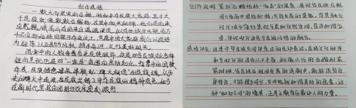 团总支、学生会举办“AI 聚力·共绘民族同心圆”创意比赛,鼓励2025级学生运用多样化的艺术形式,表达对民族团结的理解。同学们书法作品笔力遒劲,挥毫泼墨间书写着“民族团结一家亲”的坚定信念;图文并茂的手抄报和创意剪贴画,生动呈现了各民族文化的丰富多样与交融互鉴,借助生成式人工智能APP,同学们将个人思考呈现为一幅幅既充满现代科技感又不失艺术魅力的画作,为传统艺术创作注入了新鲜活力。